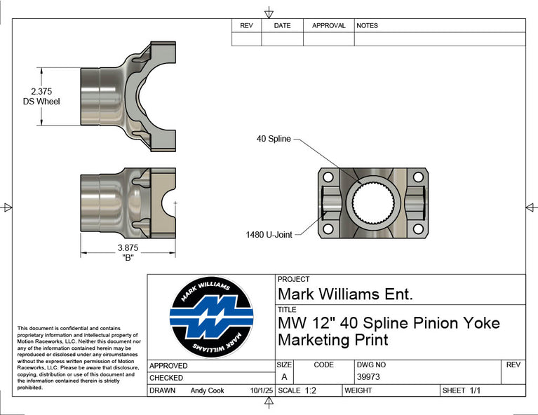 Uses 1480 u-joint. End of pinion yoke to u-joint center ("B") is 3-7/8". 2.375” diameter for computer pick up ring. Produced from 7075 aluminum and finished with exclusive MW gold coating process. All machining is done in relationship to the spline pitch diameter to ensure each yoke is symmetrical for balance and smooth operation. Utilizes billet steel cap kit for added strength. - Sold separately. Weight 1.2#