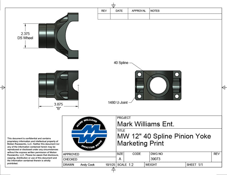 Mark Williams Extreme Duty 4340 billet steel pinion yokes offer ultimate strength for your pinion yoke which is a high stress area on any rear differential. This Mark Williams 12" 1480 U joint style yoke is designed to work with 40 spline pinion. All machining is done in relationship to the spline pitch diameter to ensure each yoke is symmetrical for balance and smooth operation.