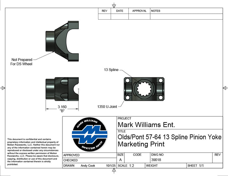 Mark Williams Extreme Duty 4340 billet steel pinion yokes offer ultimate strength for your pinion yoke which is a high stress area on any rear differential. This Olds/Pontiac 57-´64 style yoke is designed to work with 13 spline pinion. All machining is done in relationship to the spline pitch diameter to ensure each yoke is symmetrical for balance and smooth operation.